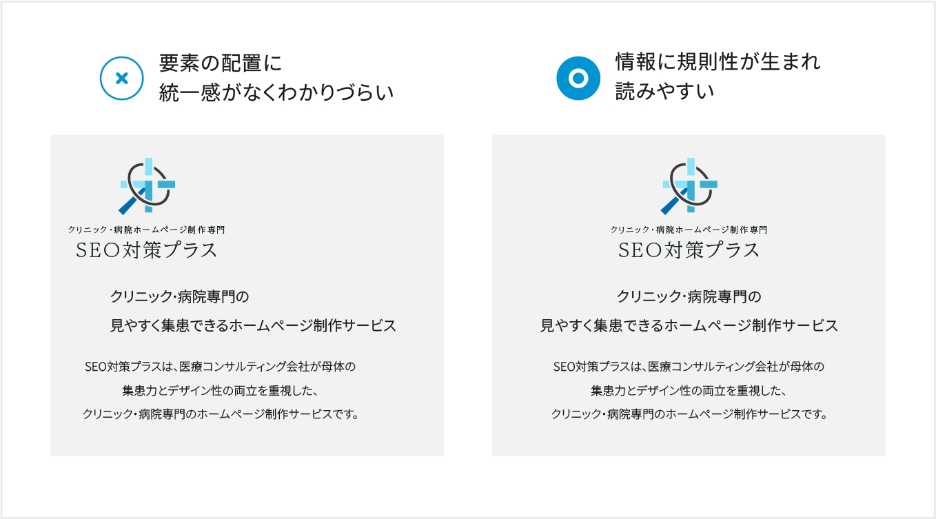 要素を「見えない線」に沿って整えることで、デザインに統一感が生まれ読みやすくなります。規則性ができることで、患者さんは情報の位置を把握しやすくなり、求めている情報にスムーズにたどり着きやすくなります。