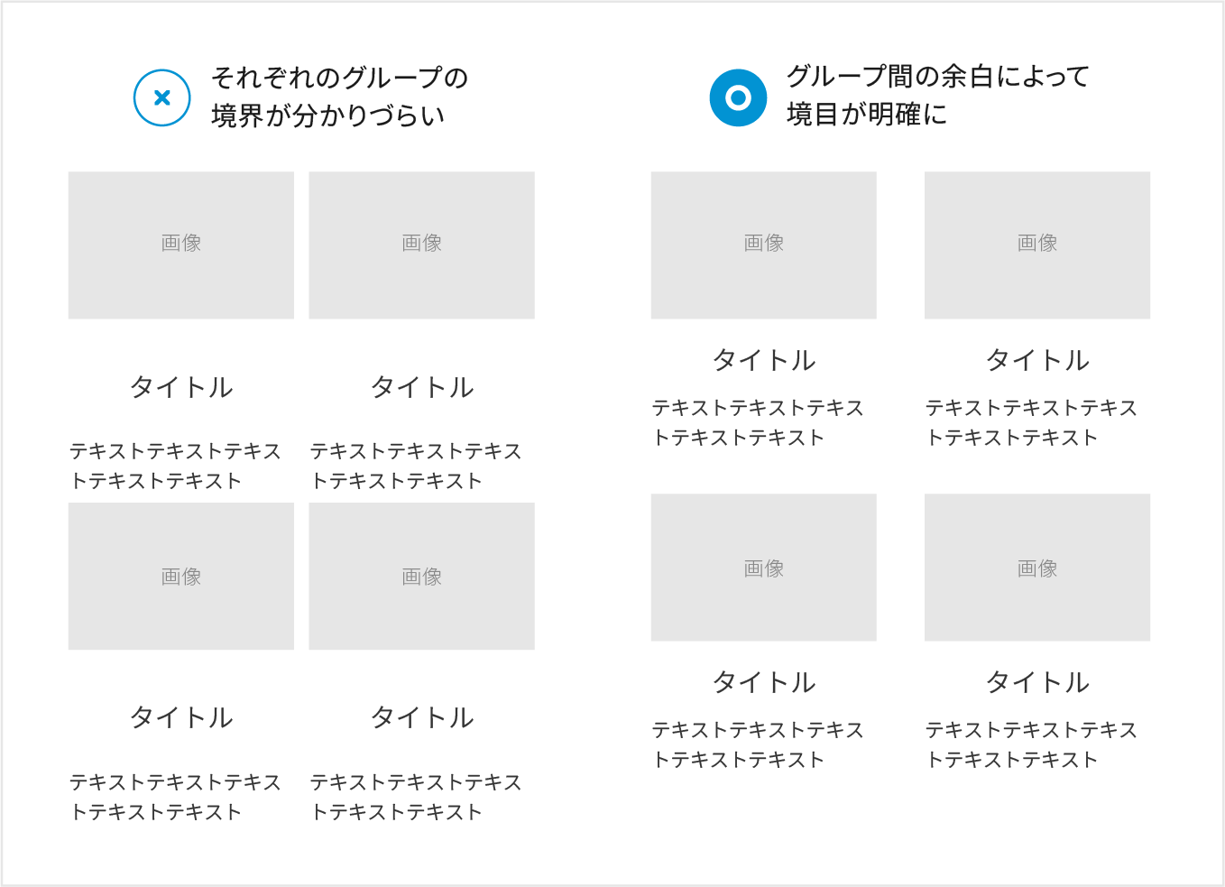 また情報量の多いグループを隣接して設置する場合は、間に広めの余白を設けることが大切です。境目が明確になり、患者さんに正しく情報を伝えることができます。